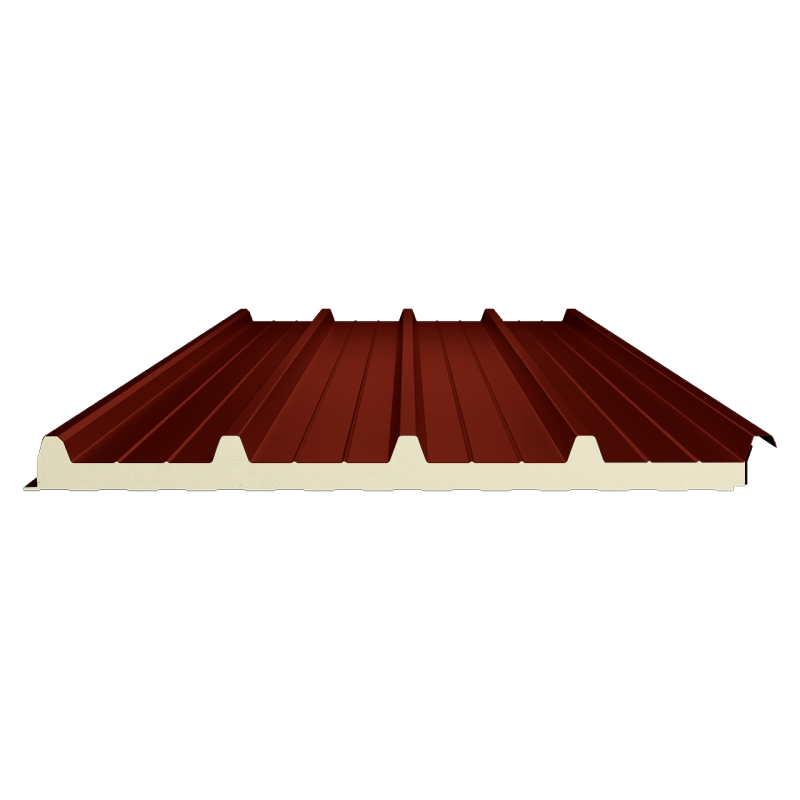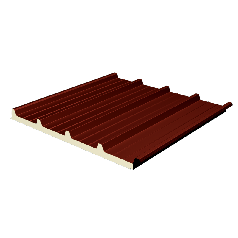 Painel sandwich ou isolante de 5 ondas, também composto por duas chapas metálicas perfiladas ligadas por núcleo de espuma rígida de poliuretano (PUR) ou polisocianurato (PIR), garantindo elevado isolamento térmico.